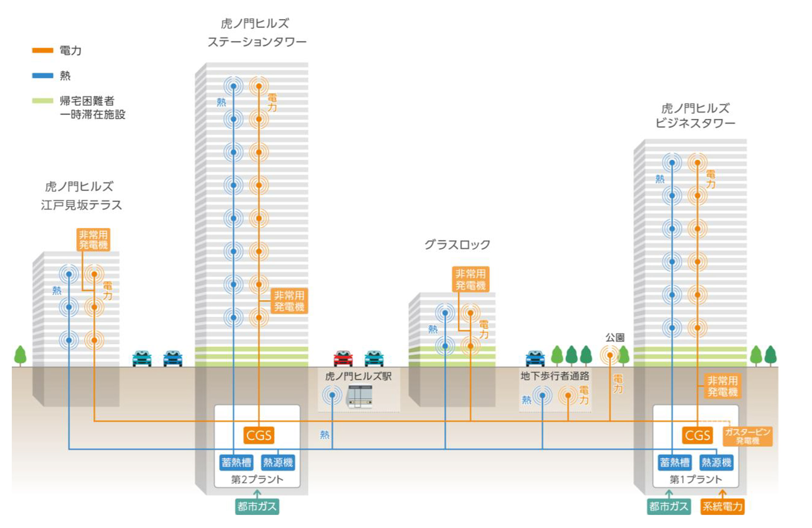 「虎ノ門ヒルズ」では、街全体にエネルギーを供給する高効率エネルギーセンター「虎ノ門エネルギーネットワーク」を開設し、エネルギーの面的供給を行っています。2020年に「ビジネスタワー」の地下に第1プラントを開設し、2023年に「ステーションタワー」の地下に第2プラントを開設予定です。多彩な都市機能を高度に複合させたコンパクトシティで、エネルギー効率の高い各種システムを採用し、エネルギー供給網をネットワーク化して街全体で面的に利用することで、環境効率に優れた都市を実現します。