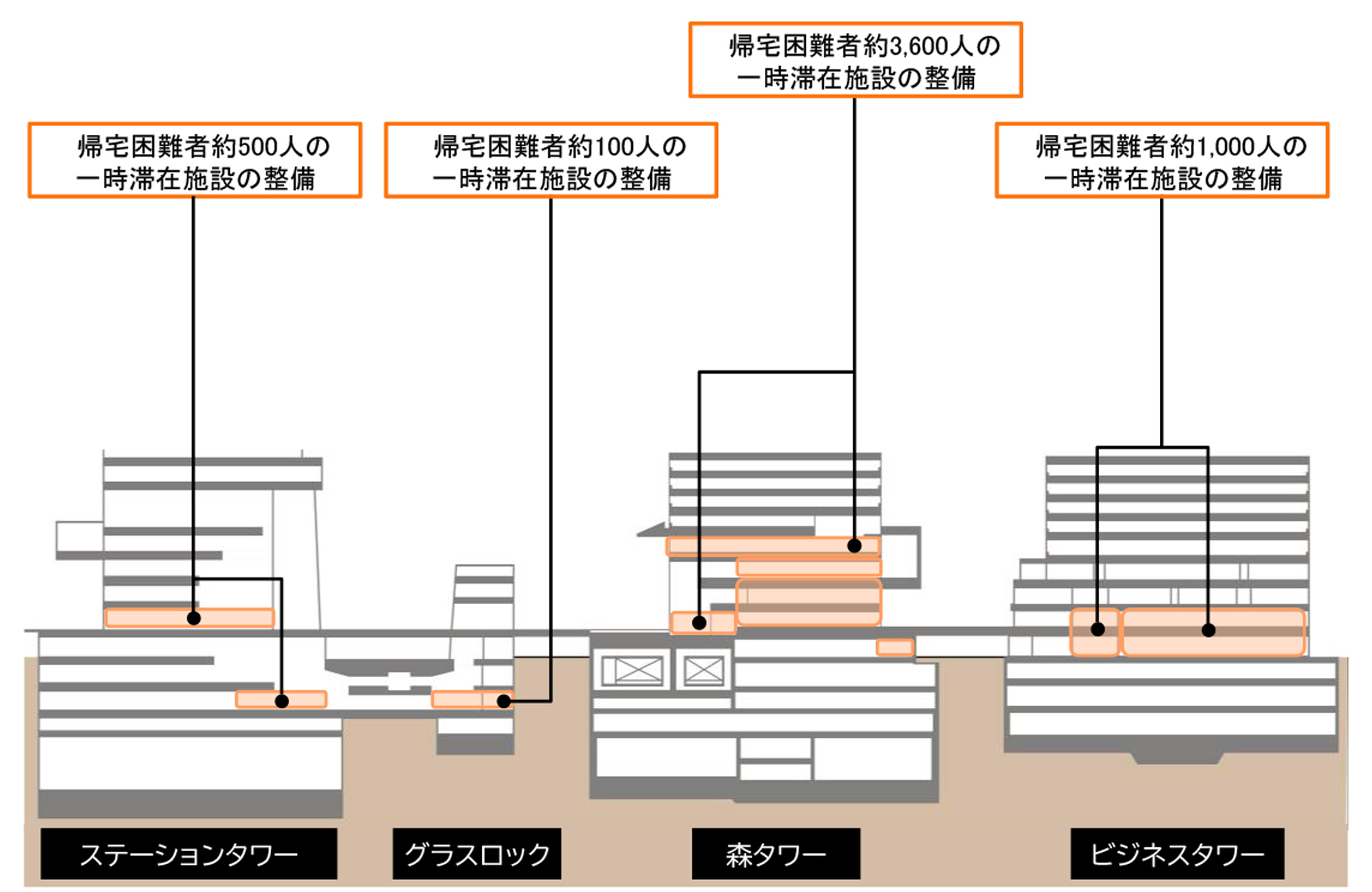 帰宅困難者対策の一環として、「森タワー」と「ビジネスタワー」に、それぞれ約3,600人、約1,000人分の一時滞在スペースを確保。また、「ステーションタワー」では、約950人分の一時滞在スペースと約900人分の一時滞留スペースを整備(B街区を含む)する予定です。すべて合わせると、約7,000人規模の滞在スペースを確保可能です。加えて、3日間の受け入れに備えた備蓄倉庫や防災井戸、災害用電力も確保。地域の防災拠点の役割を果たします。